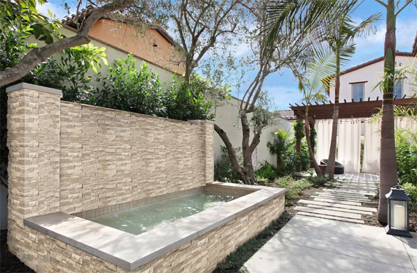 如果你很喜欢水景效果,还可以在院内增加文化石水景墙,它是一个组合式的趣味节点。采用2公分厚度的文化石作为饰面材质,会为你家庭院装修带来一丝高端体验感效果。水池底部可以安装喷泉出口,并且搭配水底射灯。这样在夜晚都可以看到美丽而欢快的水柱喷涌效果。素雅混凝土的使用能够形成格调鲜明的对比,将设计的样式做好,例如块面感、结合汀步小径的样貌,不仅利于欣赏,同样也可以节省一部分造园费用。
